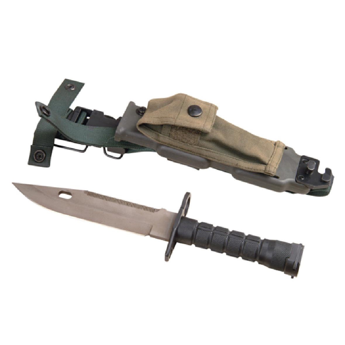 M9刺刀可作單兵匕首使用,具有砍、削、刺、劈、鋸等功能,可剪斷4毫米以下的鐵絲,刺穿1毫米厚的低碳鋼板;當(dāng)作為刺刀使用時(shí),可以與M16自動(dòng)步槍相連接;附件袋中可容納手槍彈匣及其他小件物品,適合野外生存使用。